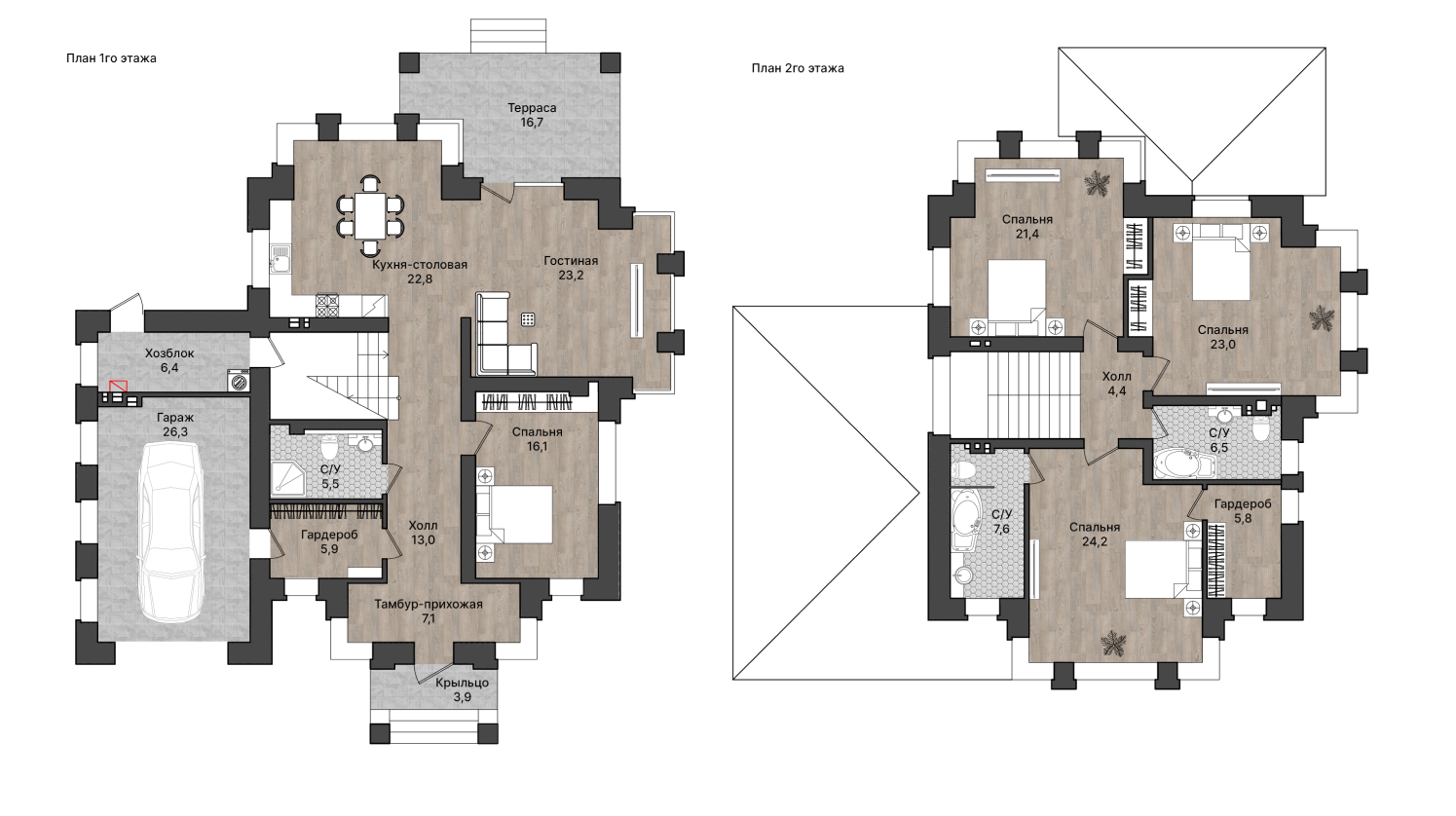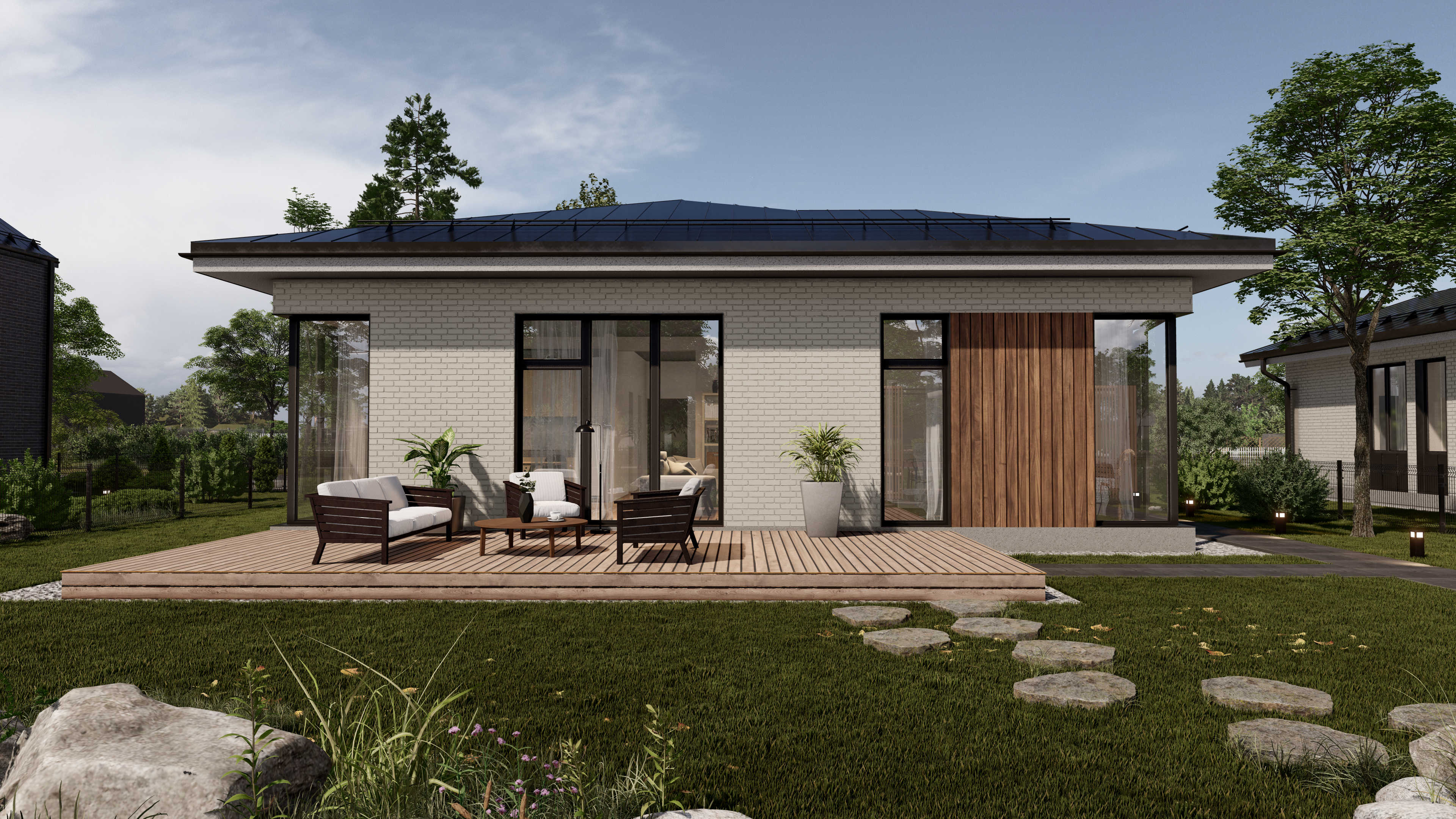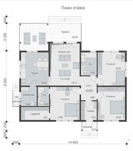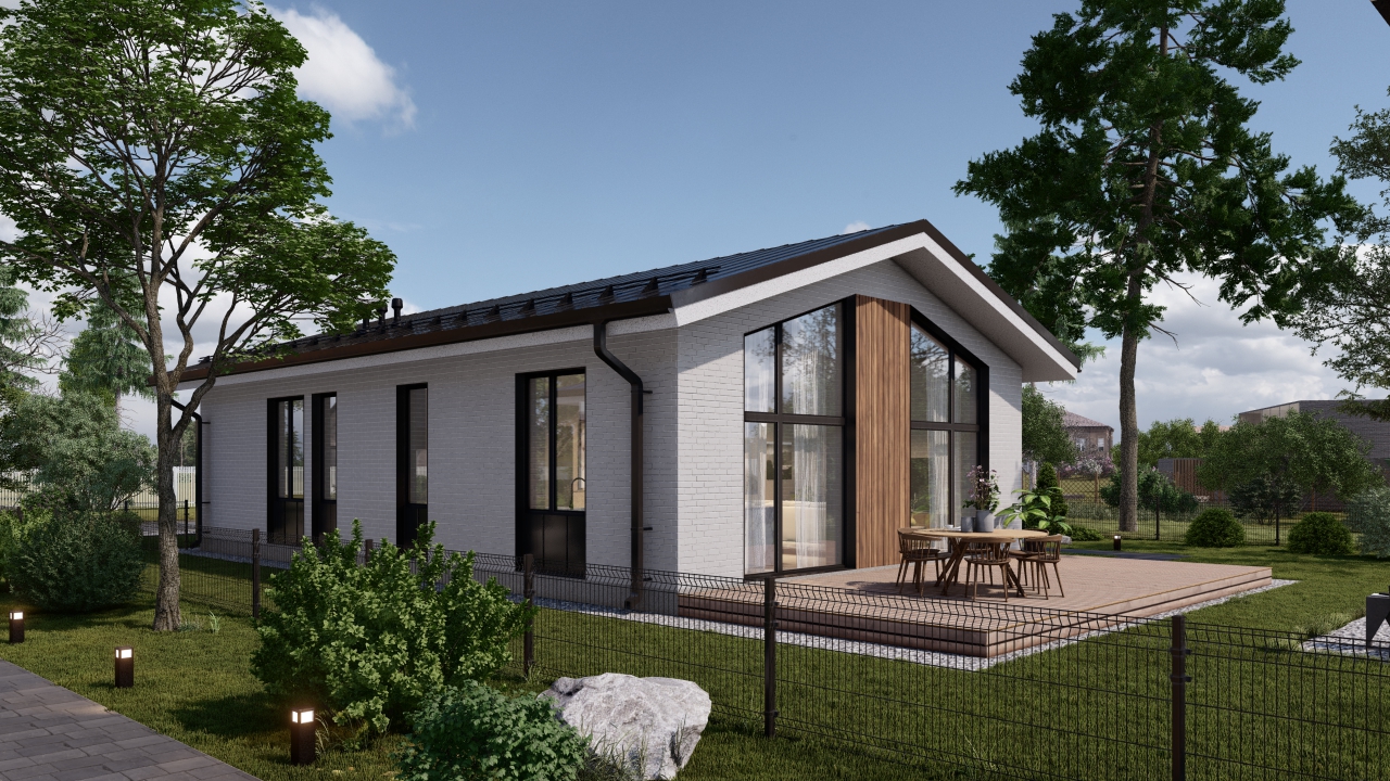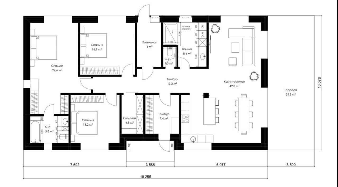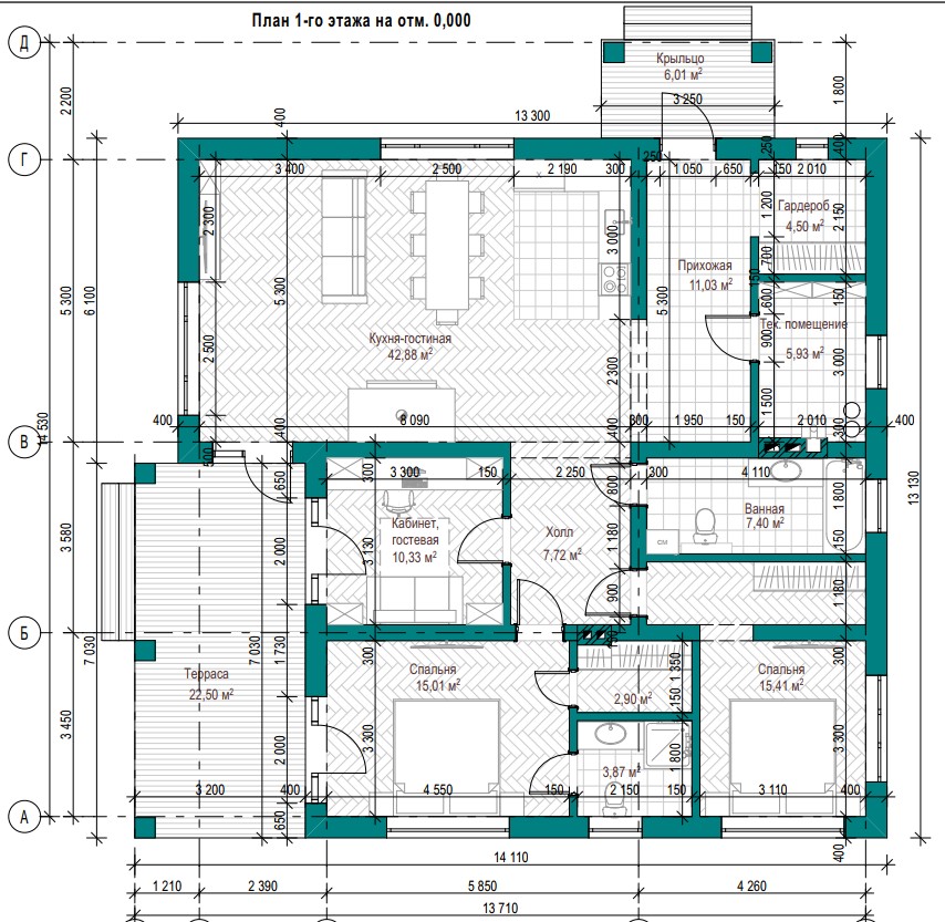 - Кухня-гостиная 23 м², терраса 22,1 м²