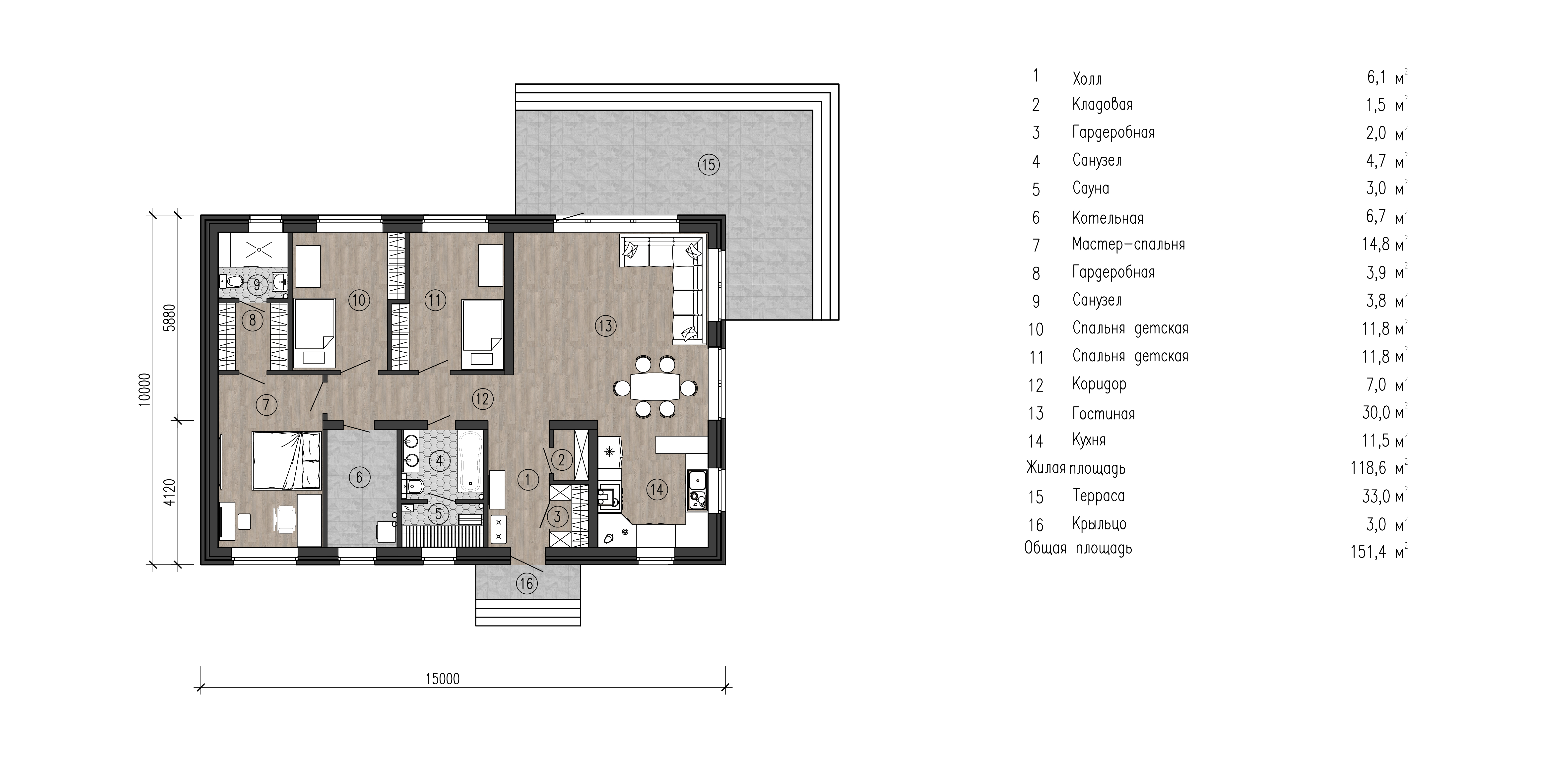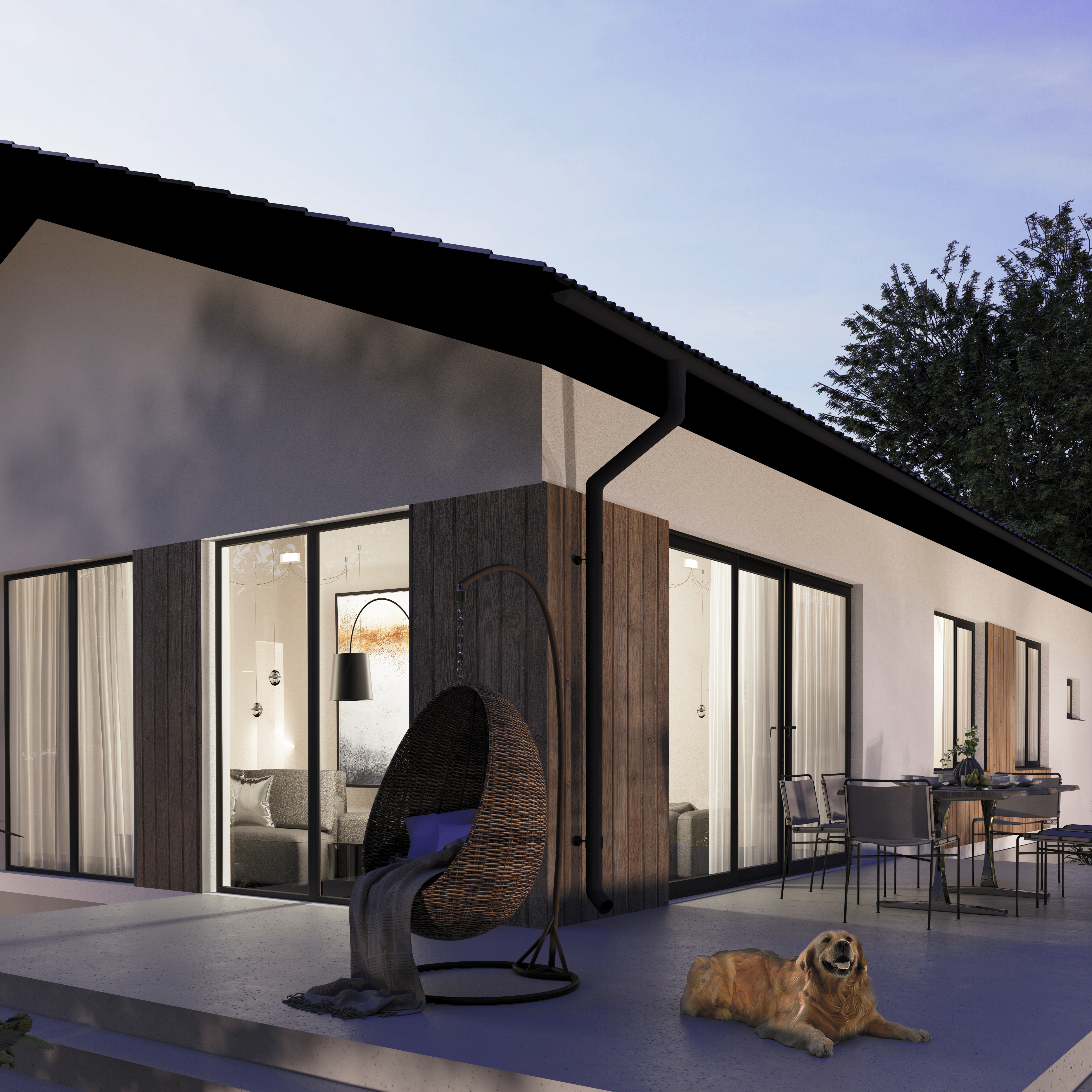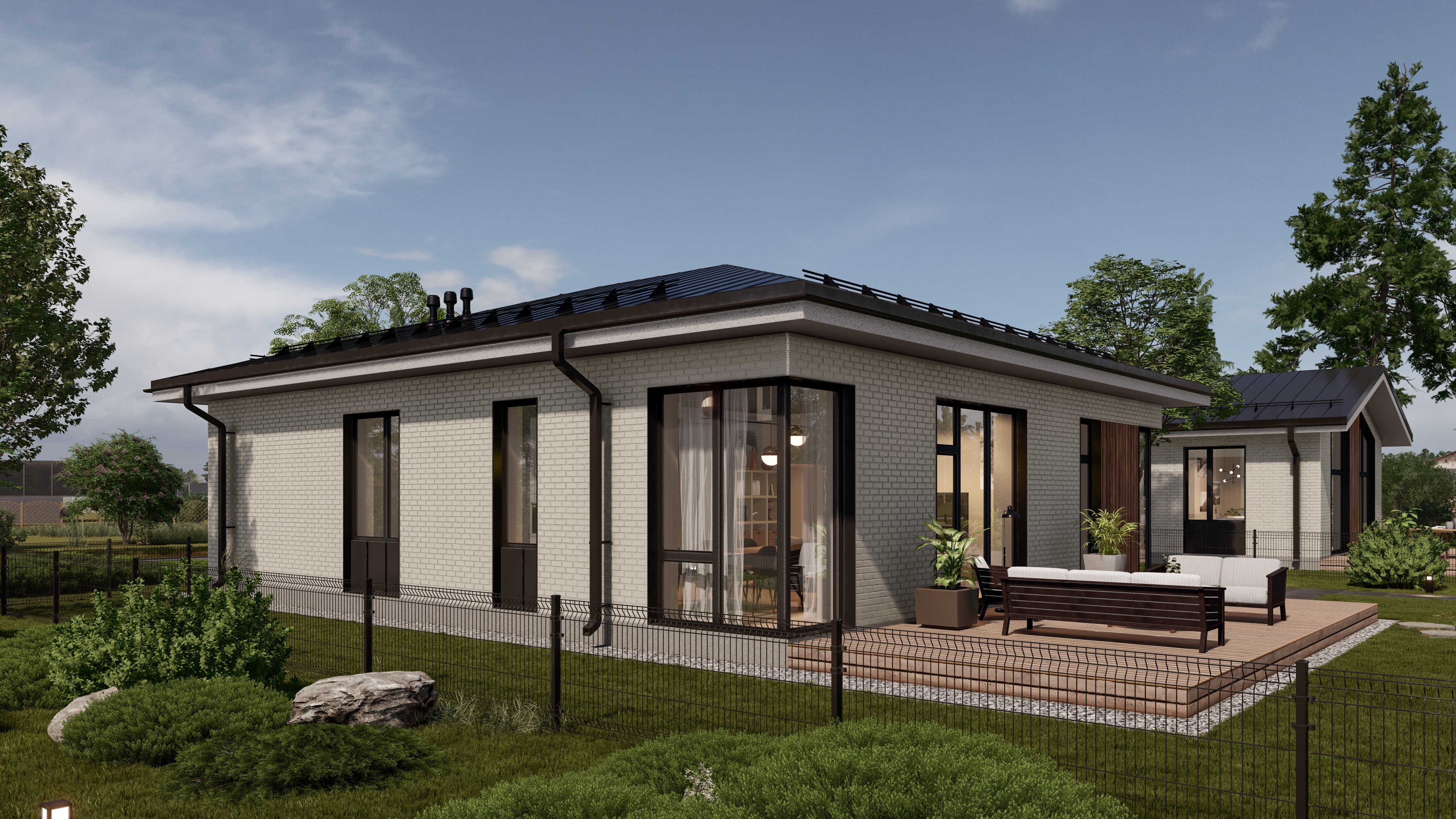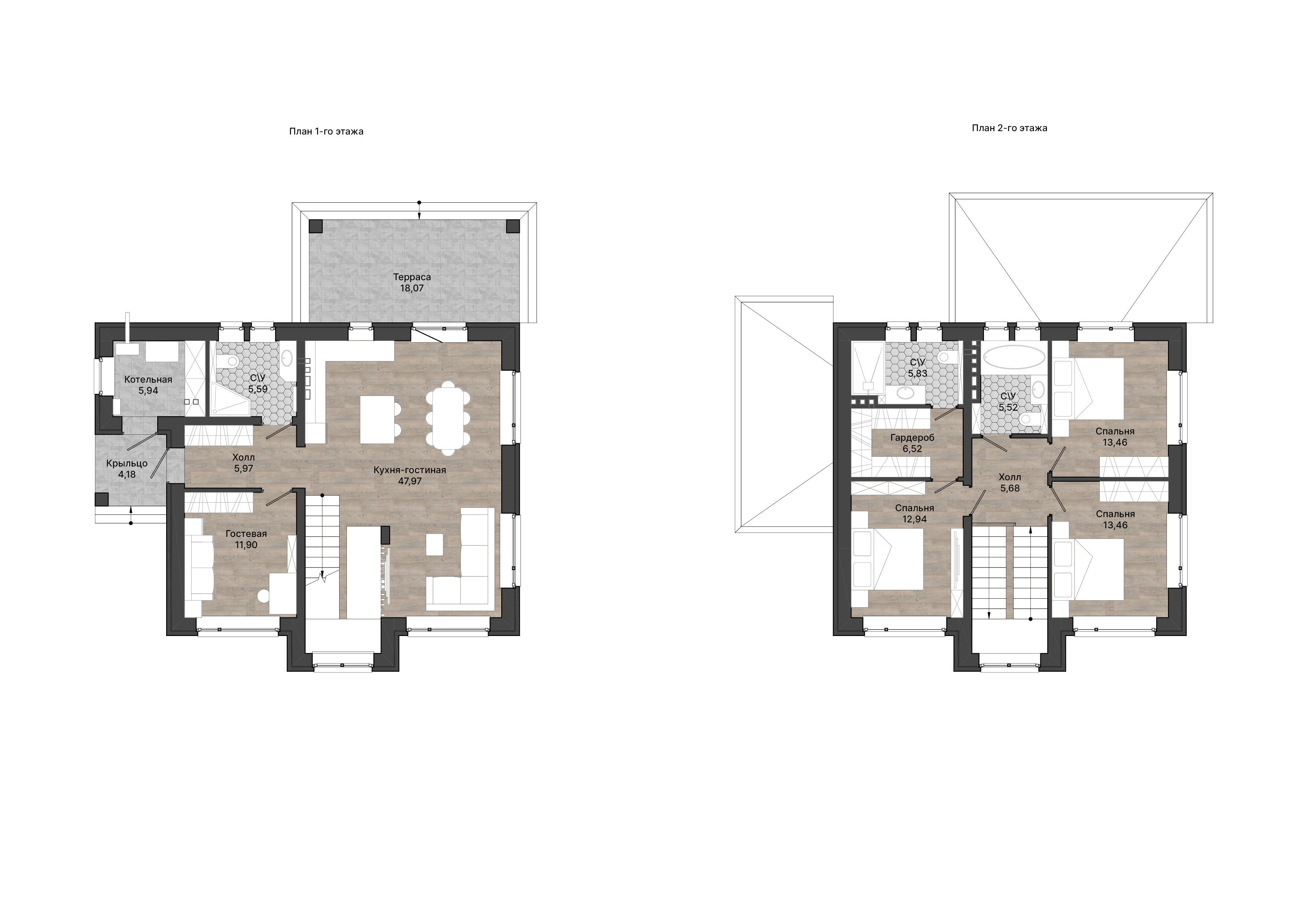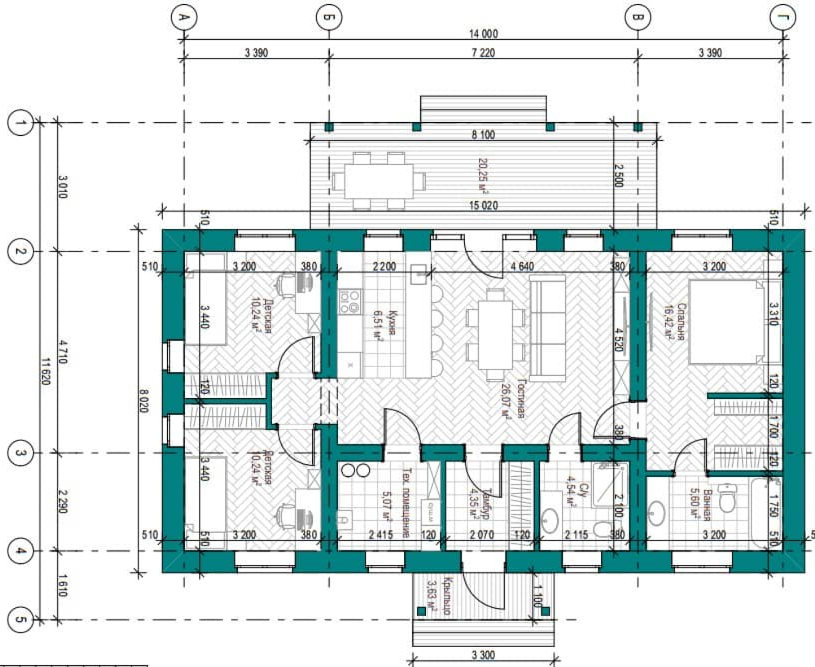 - Кухня-гостиная 23 м², терраса 22,1 м²