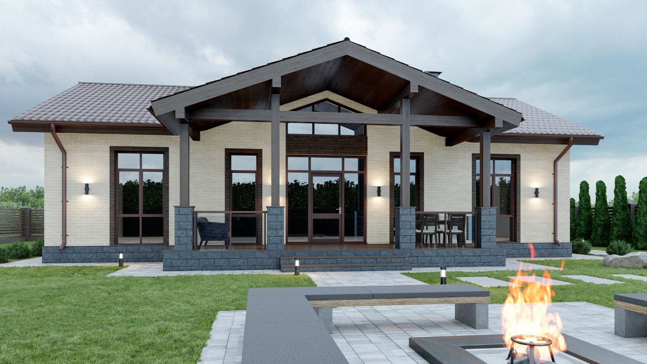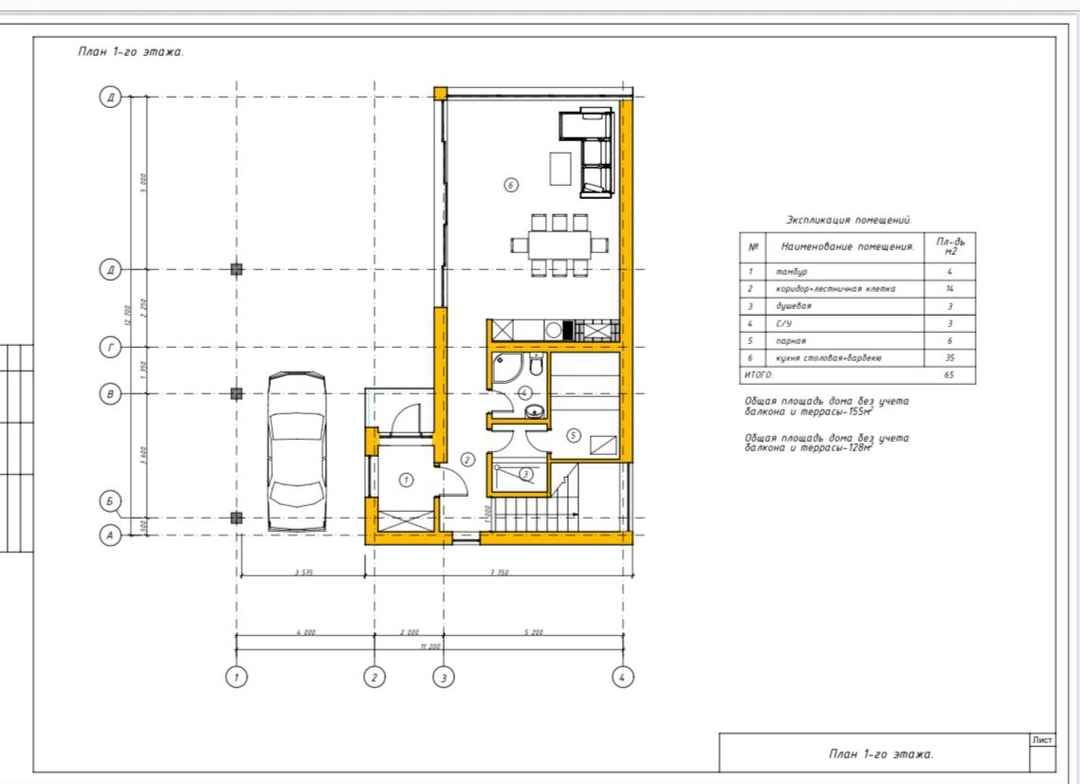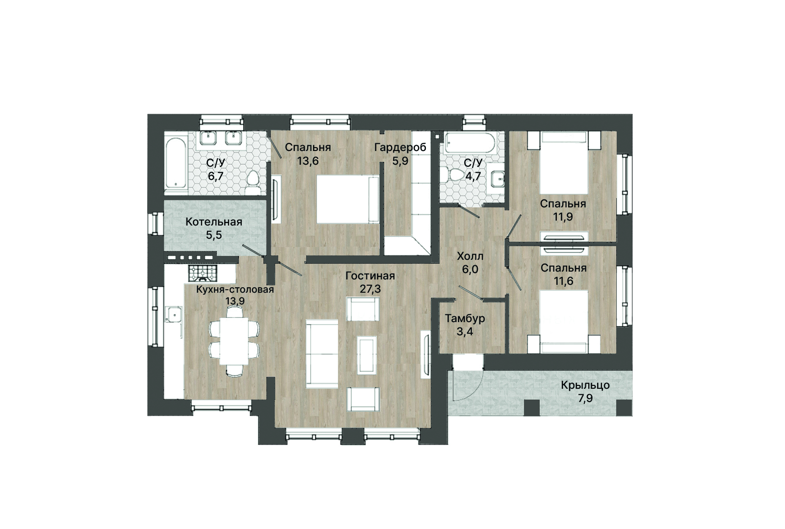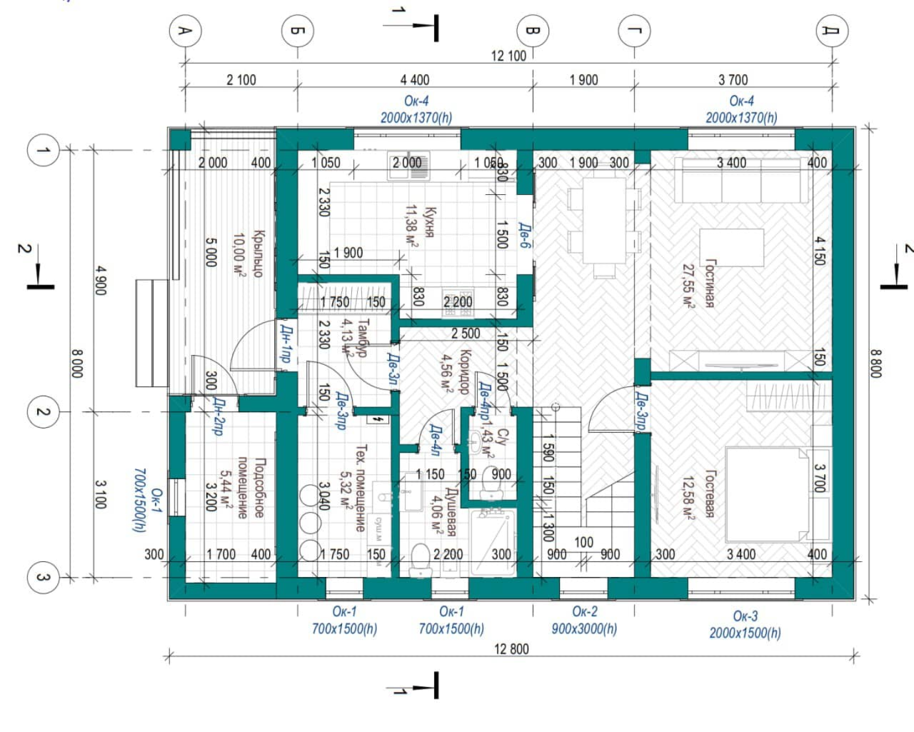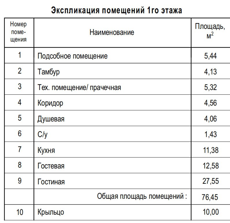 - Кухня 11,38 м², гостиная 27,55 м², крыльцо 10 м²