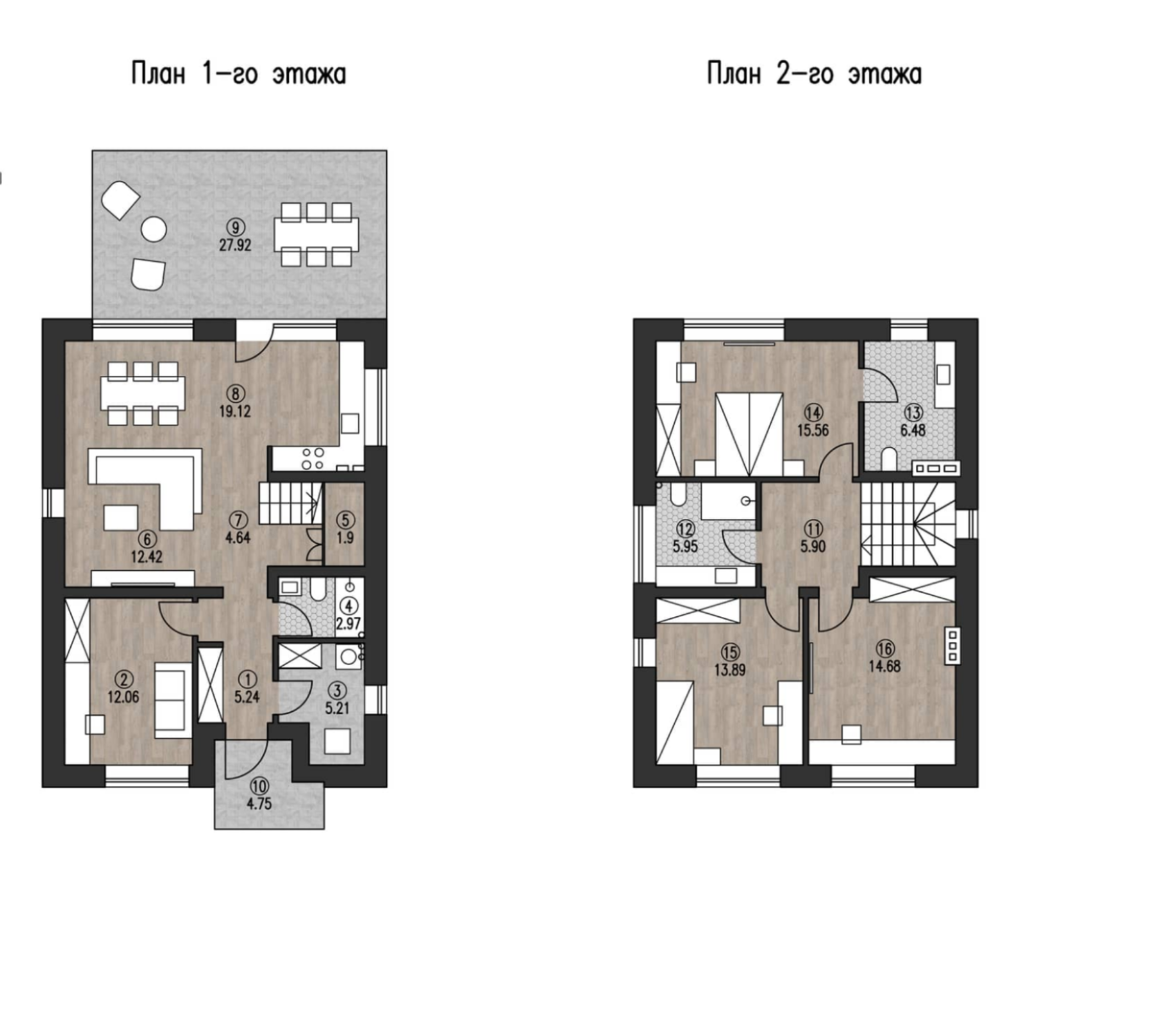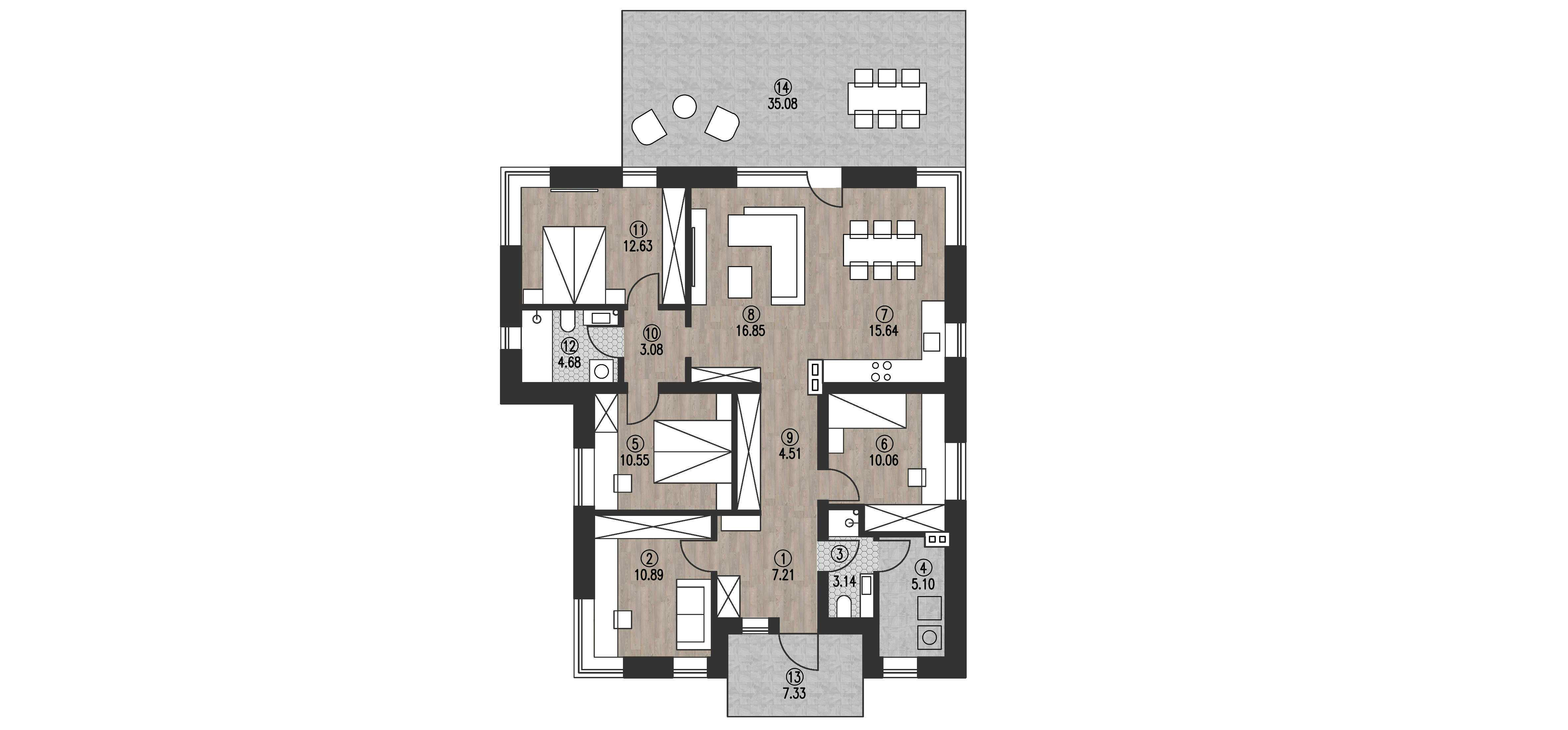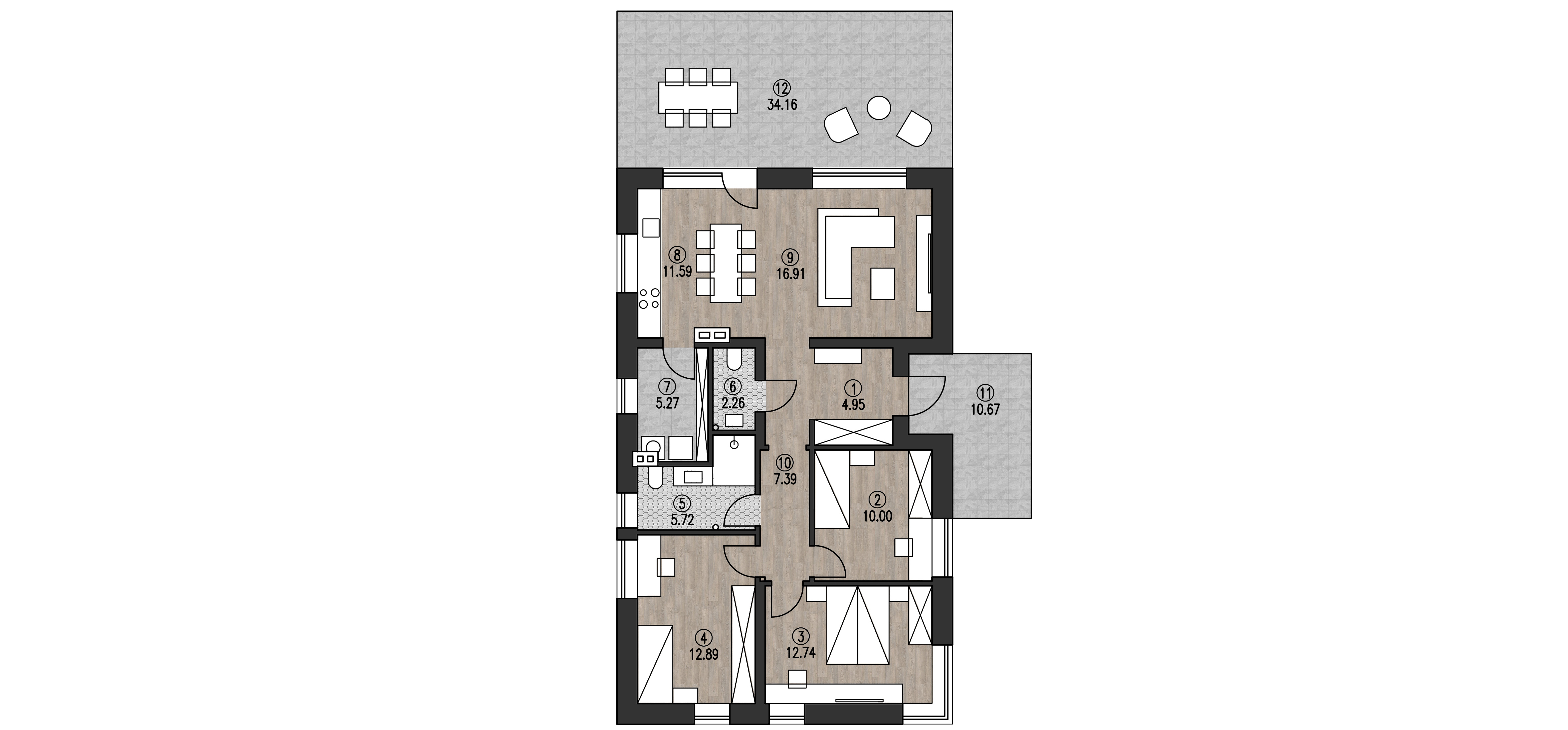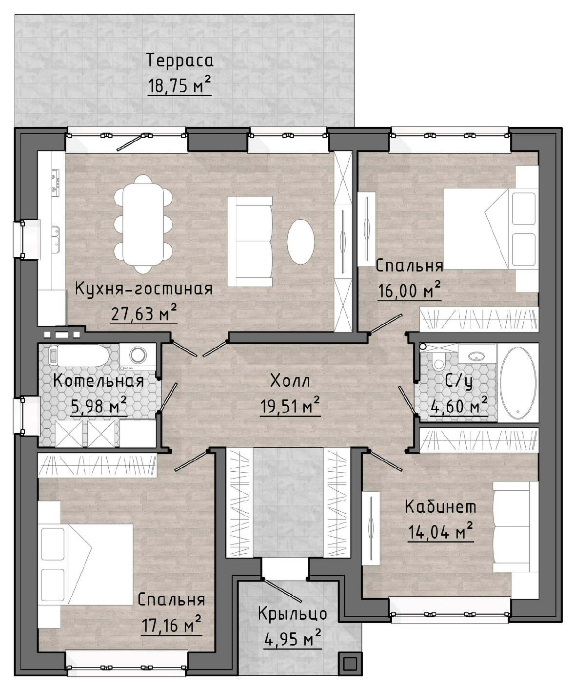 - Кухня 12.37 м², гостиная 27.44 м², терраса 7.75 м²