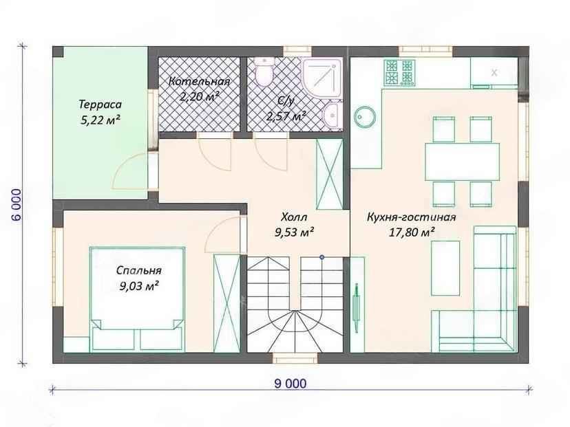 - Кухня-гостиная 17,8 м², терраса 5,22 м²