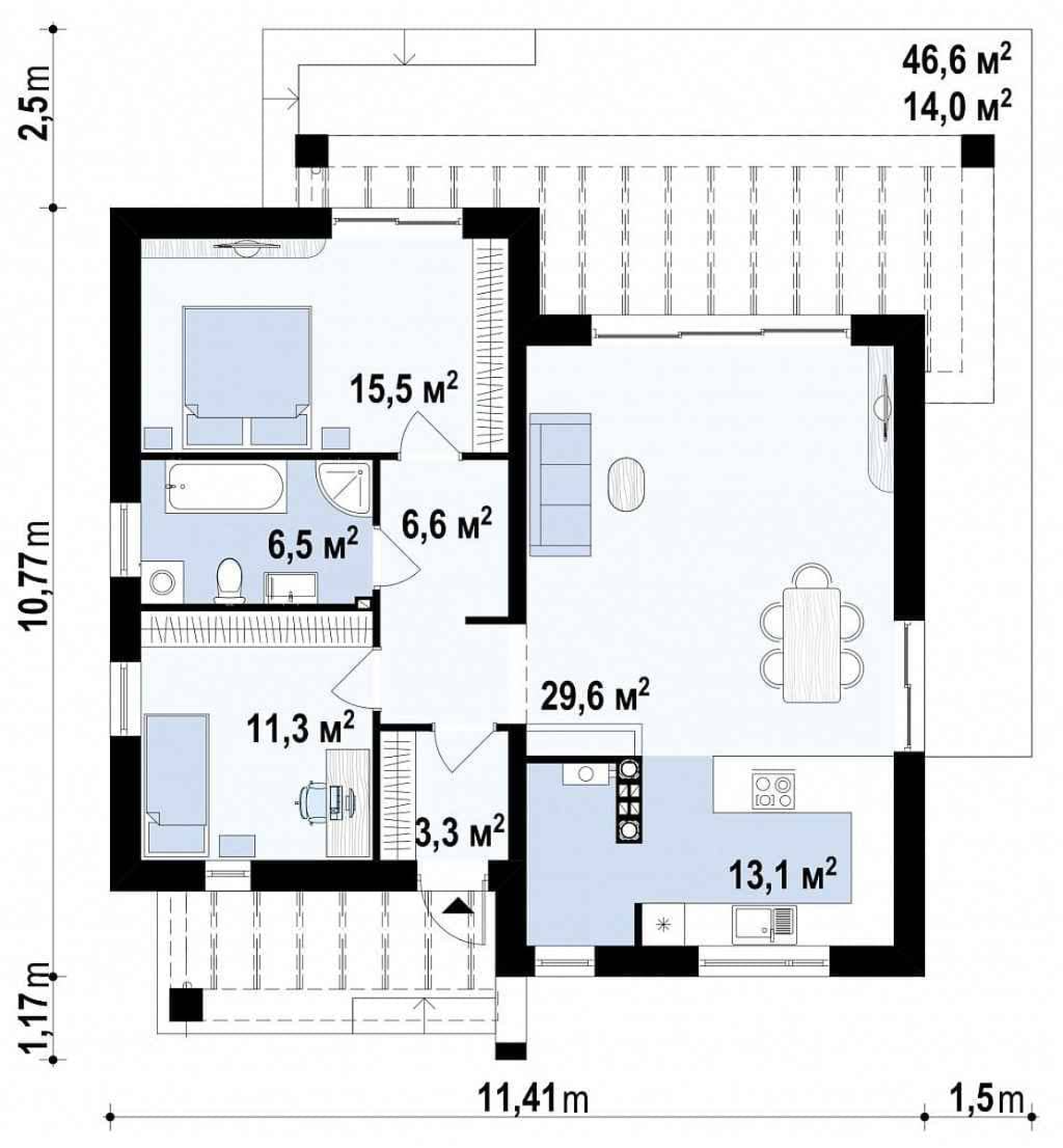 - Кухня-гостиная 41,40 м², терраса 11,25 м²